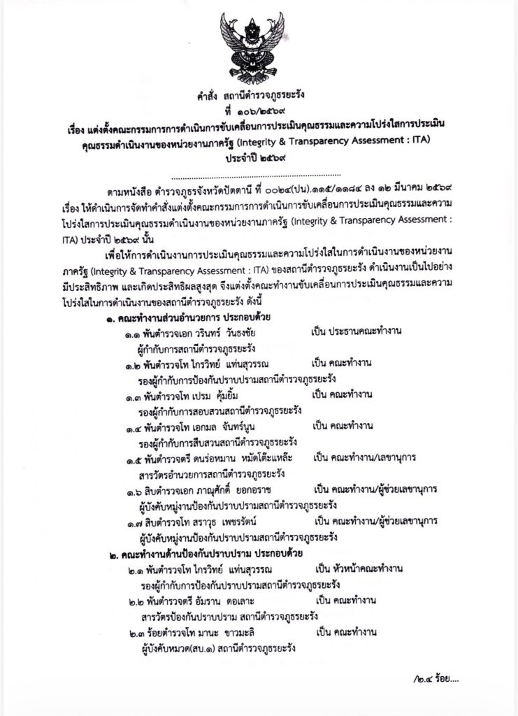 คำสั่งเเต่งตั้งคณะกรรมการการดำเนินการขับเคลื่อนการประเมินคุณธรรมเเละความโปร่งใสในการประเมินคุณธรรมดำเนินงานของหน่วยงานภาครัฐ ITA ประจำปี 2568