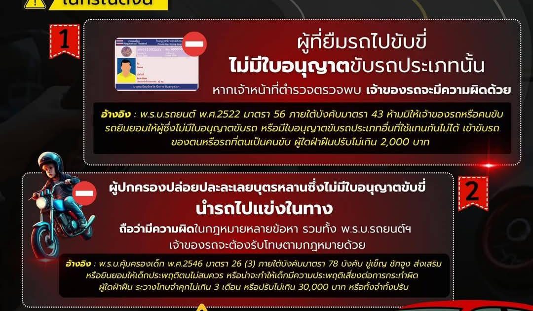 ตัวอย่างจากกรณีเมื่อวันที่ 30 ธันวาคม 2567 เกิดอุบัติเหตุรถจักรยานยนต์ชนกัน 2 คัน มีผู้เสียชีวิต 2 ราย บริเวณถนนหน้าหมู่บ้านแห่งหนึ่ง ต.พิมลราช อ.บางบัวทอง จว.นนทบุรี จากการตรวจสอบทราบว่าหนึ่งในผู้ขับขี่ไม่มีใบอนุญาตขับรถ ได้ยืมรถจักรยานยนต์จากเพื่อนสนิทมาขับขี่ แล้วเป็นเหตุทำให้เกิดอุบัติเหตุ ในทางคดีเจ้าหน้าที่ตำรวจ สภ.บางบัวทอง ได้ดำเนินการติดตามตัวเจ้าของรถจักรยานยนต์ดังกล่าวมาดำเนินคดี ในความผิด พ.ร.บ.รถยนต์ พ.ศ.2522