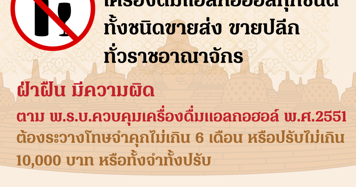 ประชาสัมพันธ์ แจ้งเตือนให้งดจำหน่ายเครื่องดื่มแอลกอฮอล์ทุกชนิดทั้งขายส่งและขายปลีกทั่วราชอาณาจักรตลอด 24 ชั่วโมง คือ หลังเวลา 24:00 น. ของคืน วันที่ 23 ก.พ.67 ไปจนถึงเวลา24.00 น. ของคืน วันที่ 24 ก.พ.67 ยกเว้นการขายเฉพาะร้านค้าปลอดอากรในอากาศยานนานชาติ หากฝ่าฝืนมีความความผิดตามตรา 39 แห่ง พ.ร.บ.ควบคุมเครื่องดื่มแอลกอฮอล์ พ.ศ.2551 โดยเคร่งครัด
